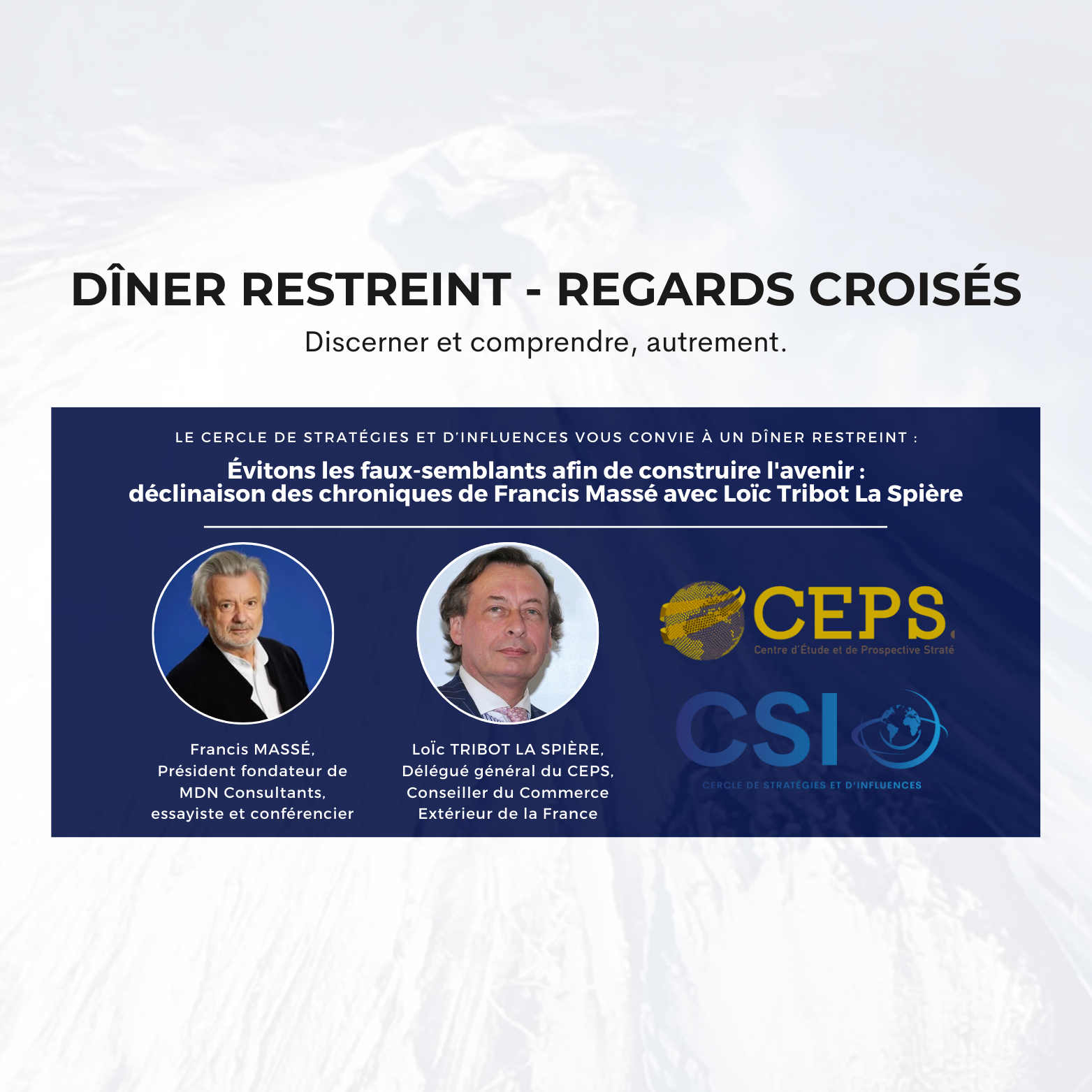 À la lumière des réflexions de Francis Massé, essayiste et conférencier, dans son nouvel ouvrage « Aviver son souffle - Au fil d’instants d’exigence », préfacé par Loïc Tribot la Spière Délégué Général du CEPS, nos discussions ont été guidées par une ligne claire : évitons les faux-semblants afin de construire l'avenir.