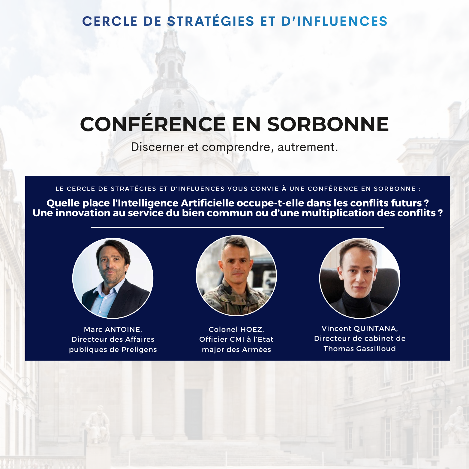 Le mercredi 28 février à 19 heures, le Cercle de Stratégies et d’Influences (CSI), en collaboration avec l’association Panthéon-Sorbonne Sécurité-Défense (P1SD), a le plaisir de vous inviter à une conférence en Sorbonne sur la place de l’Intelligence Artificielle dans les conflits futurs, entre exploitation et anticipation, prévention des menaces et perspectives d'avenir.