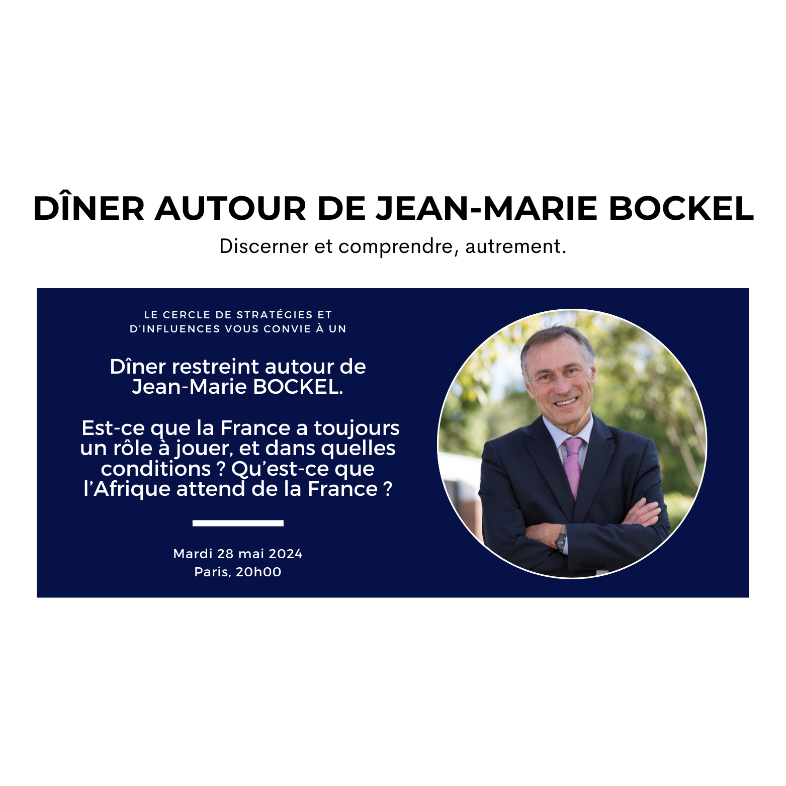 Nous vous invitons à dîner autour de Jean-Marie Bockel, ex-ministre et envoyé personnel du Président de la République en Afrique de l'Ouest. Ce dîner co-porté avec le Centre d'étude et de prospective stratégique se déroulera dans un salon privatisé du 7e arrondissement de Paris autour des questions liées à la présence militaire française en Afrique.