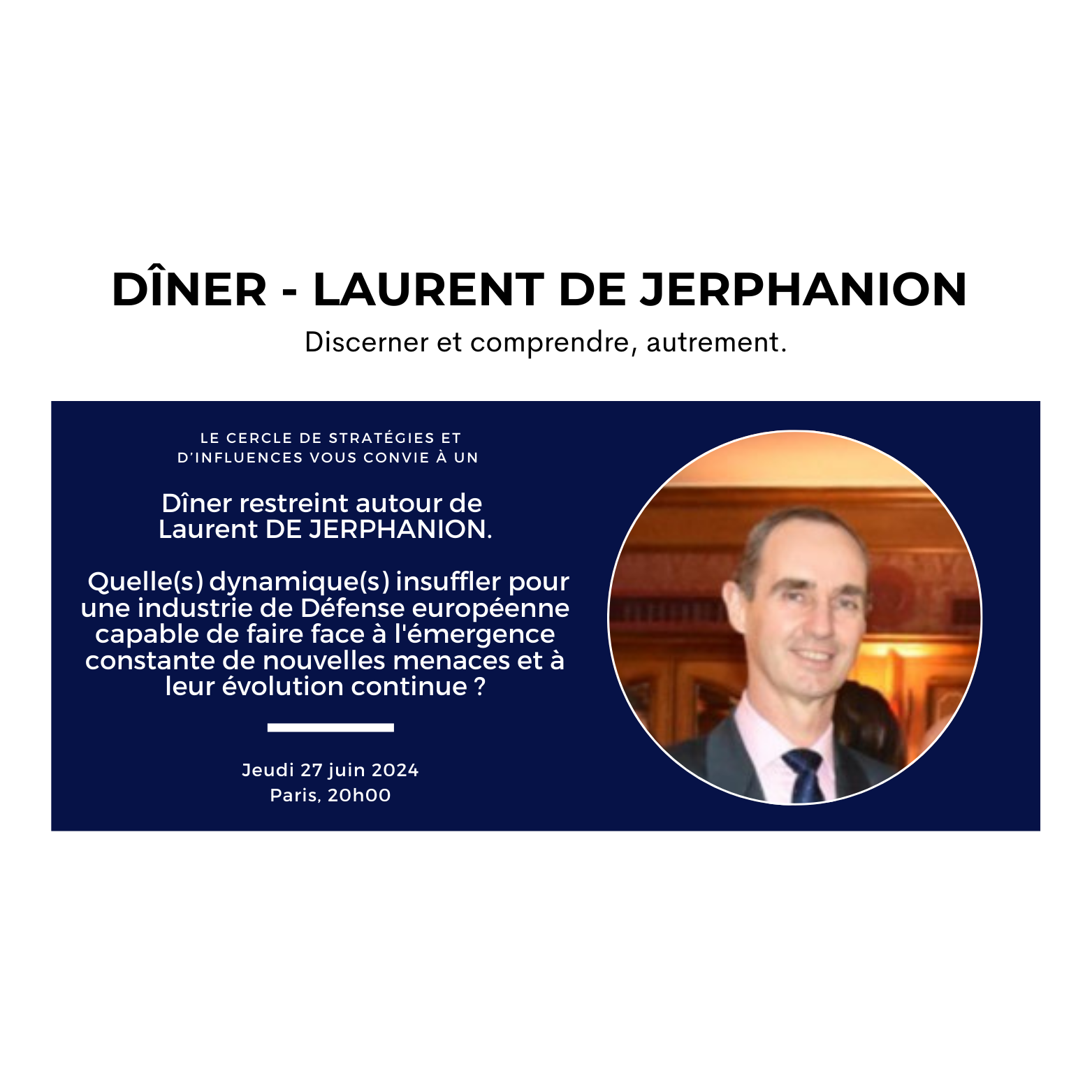 Le Cercle de Stratégies et d'Influences a le plaisir de vous convier à un dîner restreint autour de Monsieur Laurent deJerphanion, Senior Capture and Sales à Thales Land and Air Systems. Expert des questions de Défense, notre intervenant bénéficie d'un brillant parcours avec 13 années passées à la mer : breveté de la Royal Navy, du Ministry of Defence ainsi que de l’Ecole de Guerre, il est aussi capitaine de vaisseau, ancien chef du bureau "Stratégie politique" auprès du Chef d'Etat-major de la Marine, directeur de cabinet du préfet maritime de l’Atlantique et commandant de la frégate « Jean Bart ».